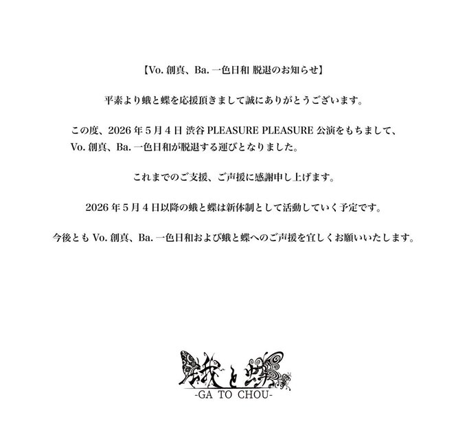 2026.2.7 蛾と蝶 Vo.創真&Ba.一色日和 脱退 NEWS X Facebook はてブ LINE Pinterest コピー 2026.02.07 【大切なお知らせ】 pic.twitter.com/YqPml99dLx— 蛾と蝶 official (@gatochou) February 7, 2026